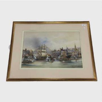 Tom MacDonald : Shipping on The Tyne, watercolour, signed, 39 cm x 59 cm, framed.