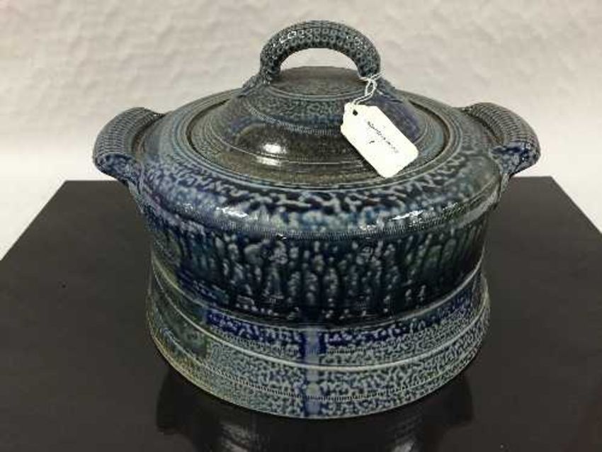 Jane Hamlyn (born 1940): A salt glazed casserole dish, in blue/green glaze with incised spiral decoration, the underside signed 'Jane Hamlyn 1989', height 23cm. CONDITION REPORT: Good condition, with no apparent faults or restoration.