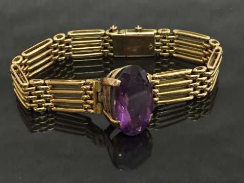 A 15ct gold gate bracelet set with an amethyst, 27.3g. CONDITION REPORT: Good conditions, with safety chain, stamped to the clasp '15'.