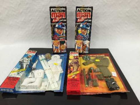 Two Palitoy Action Man Space Ranger Captain (Leader of the Space Ranger Patrol) figures, together with two Action Man Under Water Explorer uniforms, an Action Man Royal Hussar uniform, two Action Man Mountain and Arctic uniforms, an Action Man British Infantryman uniform and two Action Man Equipment Centre Rifle Racks (Stores Number 34272), all parts boxed. (10) CONDITION REPORT: Space Rangers opened and in used condition. Uniforms/rifle racks unopened and with some wear to packaging.