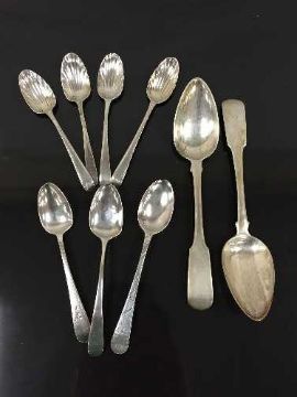 A pair of silver fiddle pattern spoons, Newlands & Grier, Edinburgh 1814. together with seven various silver teaspoons, 151.7g gross (9). CONDITION REPORT: Fiddle pattern spoons with crisp hallmarks, typical tarnishing but in good condition. Some teapoons have worn away hallmarks, all are silver.