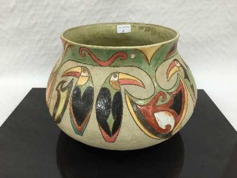 Jill Fanshawe Kato: A large stoneware jardiniere, polychrome decoration with abstract exotic bird, impressed seal to base, height 23cm. CONDITION REPORT: Good condition, no apparent faults or restoration.