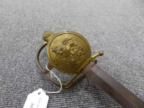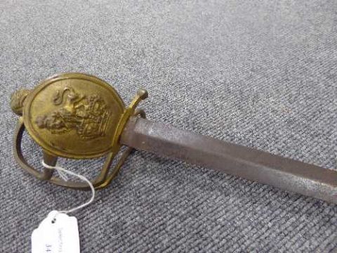A Georgian infantry officer's spadroon, 80cm straight double edge blade and brass guard, the grip bound in fine wire. CONDITION REPORT: Blade with aged rust pitting, some nicks to the edge, hilt in good condition lacking scabbard.
