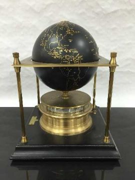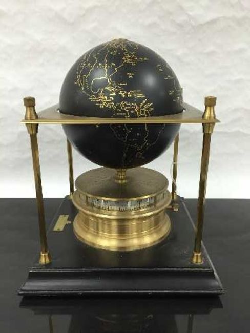 A Royal Geographical Society World Clock, 1980, the brass-cased movement with dial rotating on a horizontal plane with a black and gilt terrestrial globe, within a four pillar frame on an ebonised base, height 28 cm, with documents.