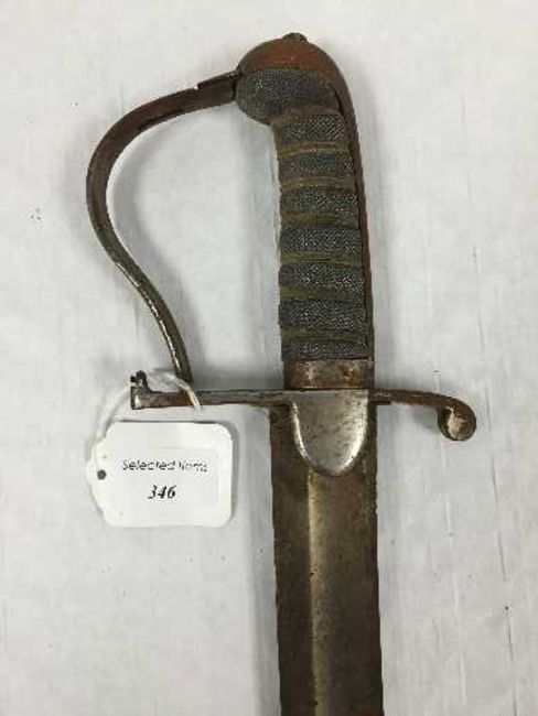 A Georgian 1796 pattern light cavalry sabre, probably for an officer, the 83cm curved blade with single fuller, wire bound shagreen grip. CONDITION REPORT: Steel parts with aged rusting/pitting, grip good. The guard is broken/detatched where the knucklebow meets the crossguard.