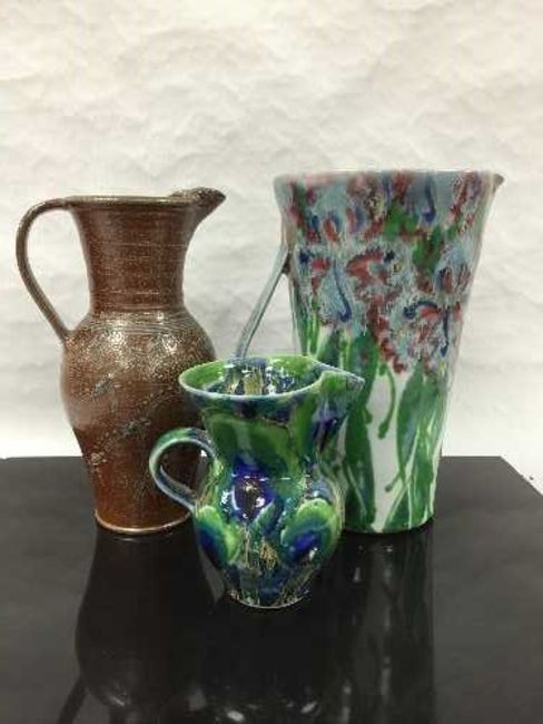 A large Dartington polychrome pottery jug, height 31cm,together with a Dartington pottery jug of waisted form, and a studio pottery salt glaze jug by Gus Malone. (3) CONDITION REPORT: Dartington pottery waisted mug with glazing flaw to side, otherwise good condition throughout.