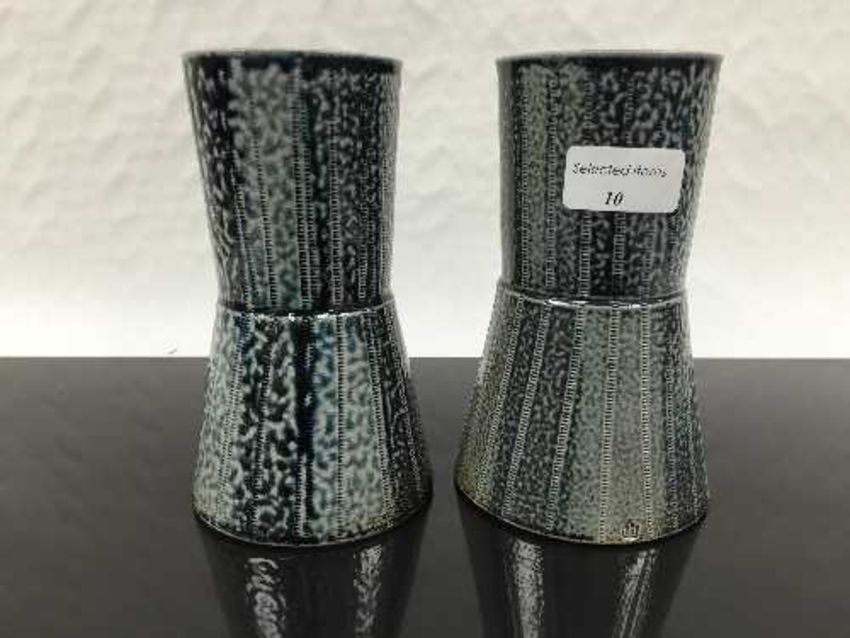 Jane Hamlyn (born 1940): A pair of salt glazed vases, in blue glaze, waisted form, impressed 'JH signature', height 17cm . CONDITION REPORT: Good condition, no apparent faults or restoration.