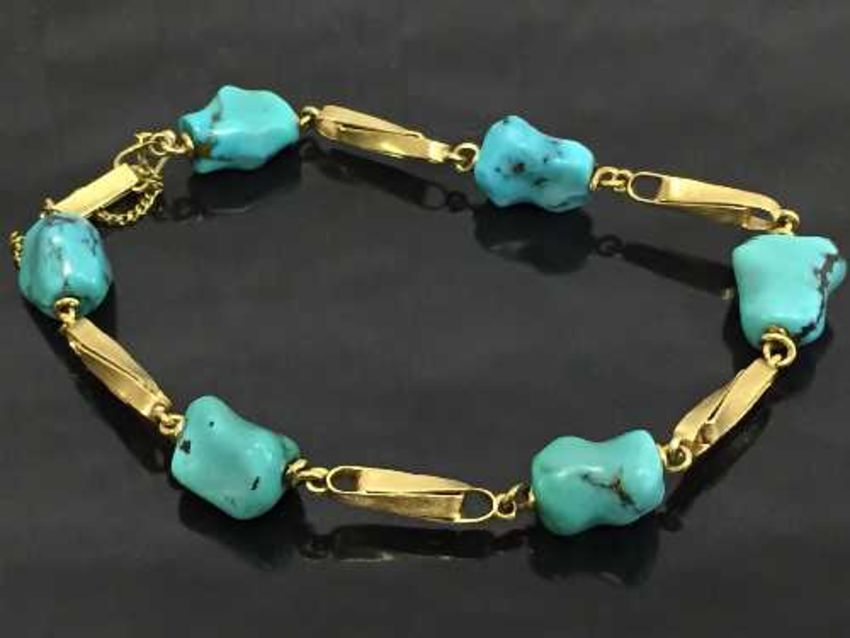 A yellow gold bracelet set with turquoise stones. CONDITION REPORT: Apparently unmarked.