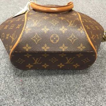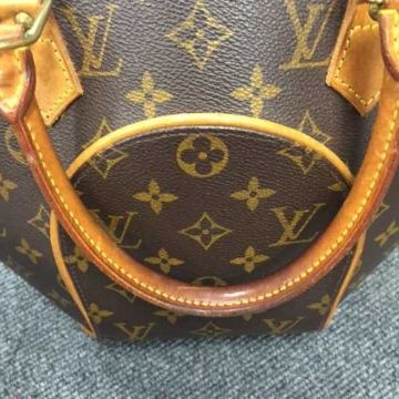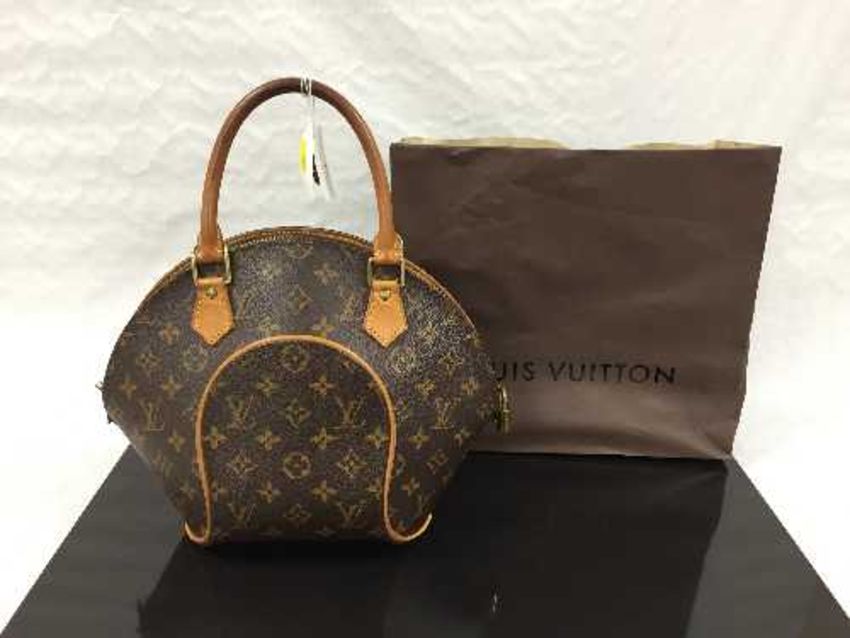 Louis Vuitton : A lady's Ellipse hand bag, monogram canvas with tan trim, zip top, with carry handle, with two keys, width at widest point 32 cm, in a brown Louis Vuitton paper bag.
