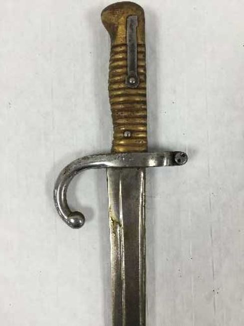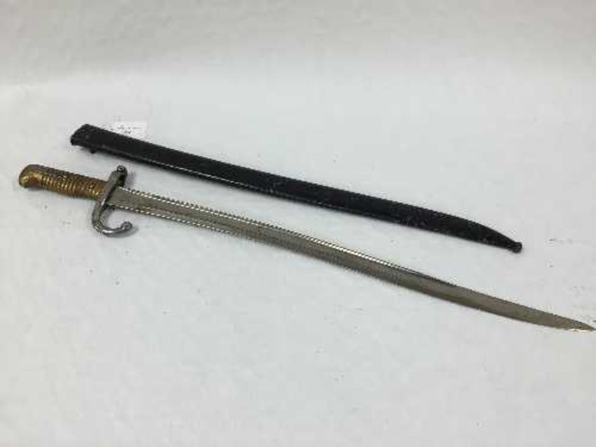A French Chassepot Yataghan sword bayonet, 57cm recurving blade, black painted steel scabbard. CONDITION REPORT: Blade clean, some wear to finish of scabbard, scabbard with some small dents, some wear to finish of grip, overall very good.