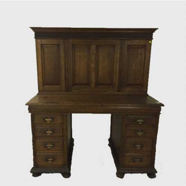 An Edwardian oak pedestal desk with cabinet above, by Thomas Sopwith & Co. Newcastle upon Tyne, width 122 cm.