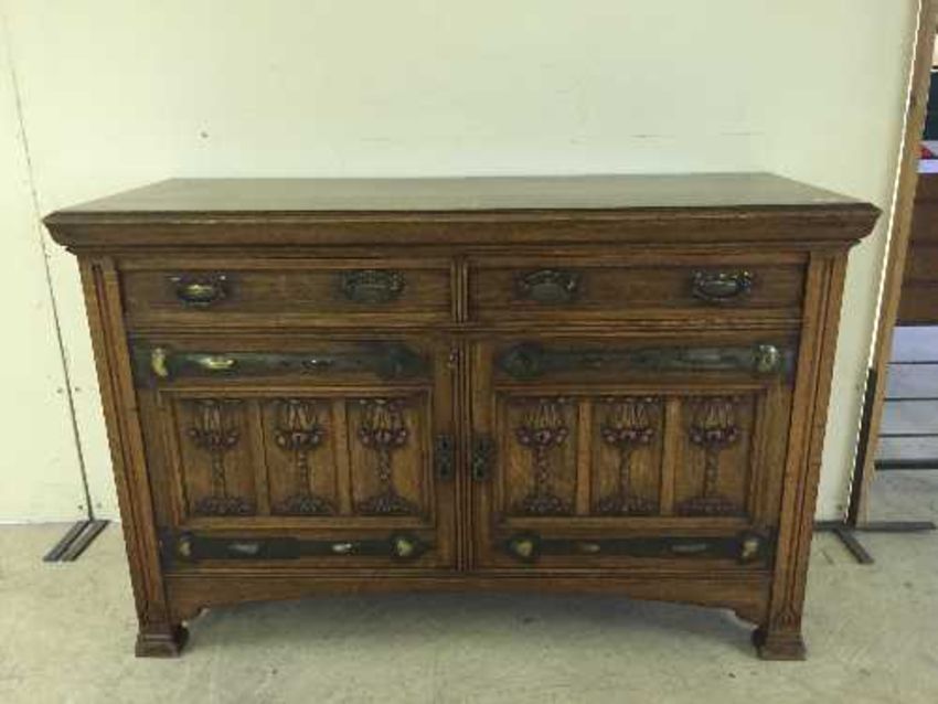 An Arts and Crafts carved oak sideboard, width 153 cm.