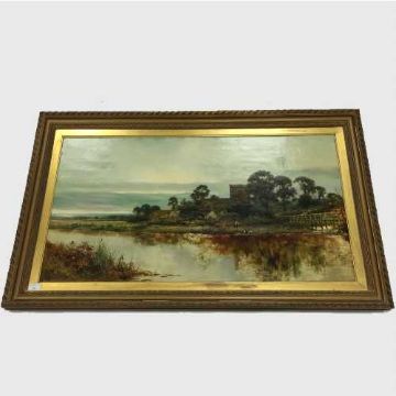 Daniel Sherrin : Figures by a lake with buildings beyond, oil on canvas, signed, 60 cm x 105 cm, framed.
