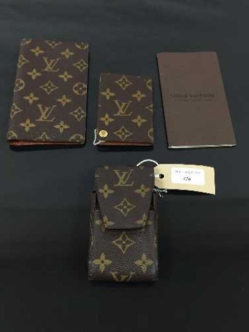 A Louis Vuitton address wallet, monogram canvas, complete with the Louis Vuitton Repertoire/Address booklet (still blank), together with a matching credit card holder and a cigarette packet holder with belt loop. (4)