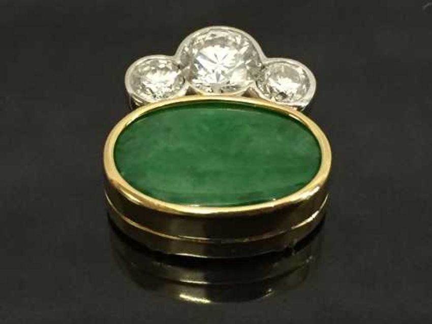 An 18ct gold jade and diamond pendant, the oval jade stone surmounted by three diamonds, the central diamond approximately 1.14ct, clarity Si, colour G, the two other diamonds approximately 0.68ct, clarity Si, colour G. CONDITION REPORT: With AnchorCert certificate numbered 20029447 and 20029414.