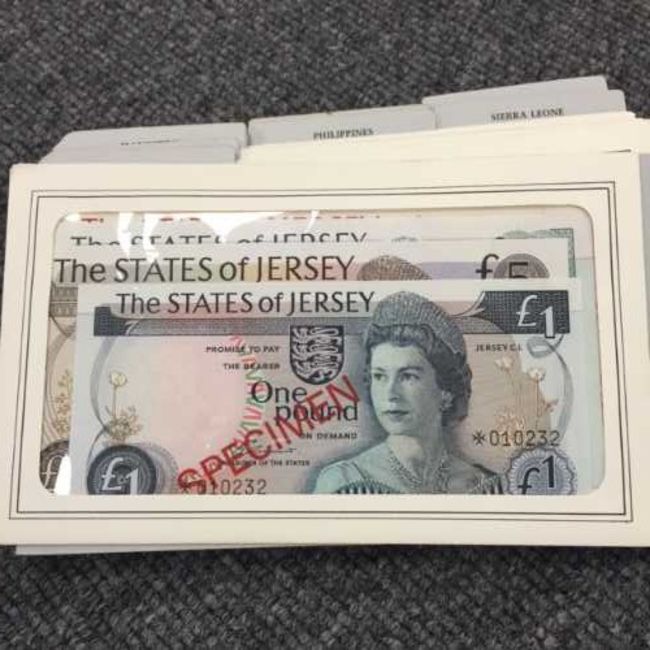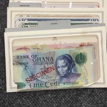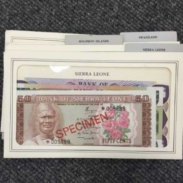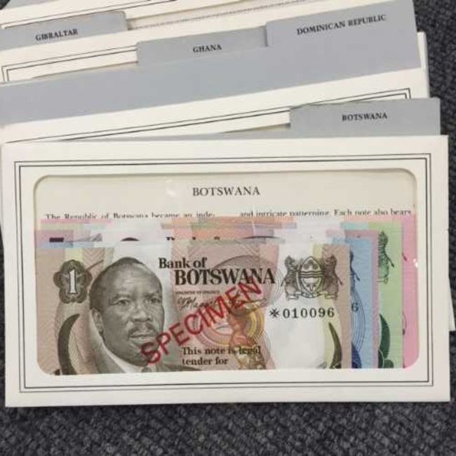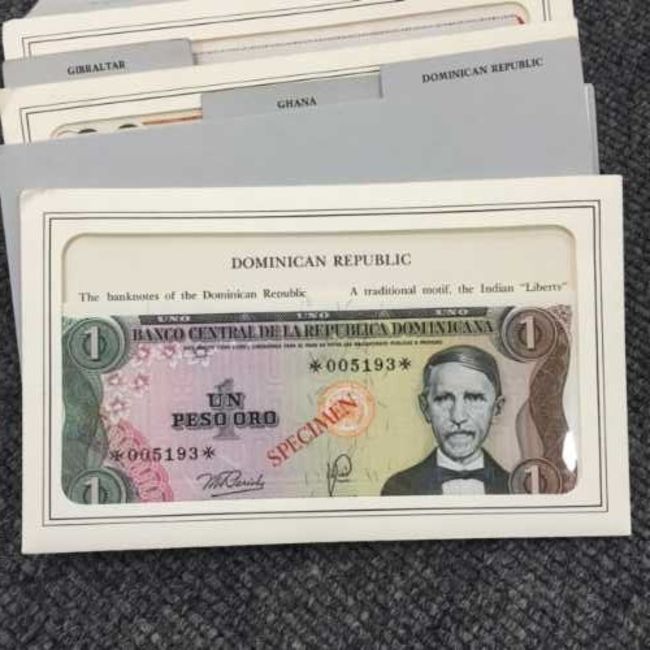 The Franklin Mint in cooperation with Thomas de la Rue and Company Ltd. of London : Official presentation sets of specimen banknotes from around the world, fifteen different countries but not Yugoslavia, in brown box with index cards.