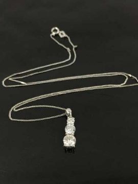 A graduated three stone diamond pendant set in platinum, suspended upon an 18ct white gold chain.
