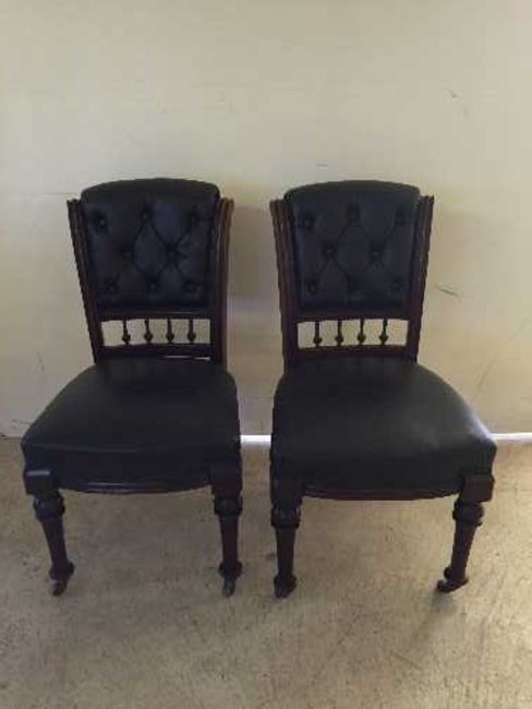 A set of six nineteenth century walnut dining chairs upholstered in studded black leather. (6)