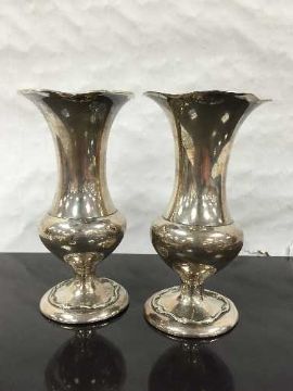 A pair of silver vases, A & J Zimmerman, Birmingham 1907, of waisted form with trumpet bowls, height 15cm. CONDITION REPORT: Some minor dents, typical tarnishing. Approx 322.2g (bases loaded).