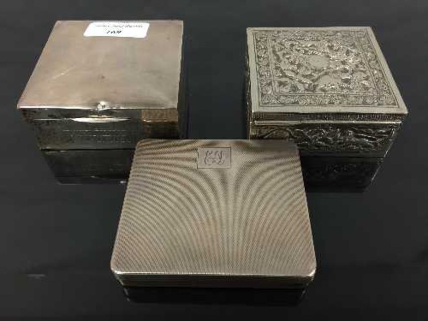 A silver cigarette case with engine turned decoration, initialled ED, together with another cigarette box, Birmingham marks, also with an Indian embossed white metal cigarette case. (3)