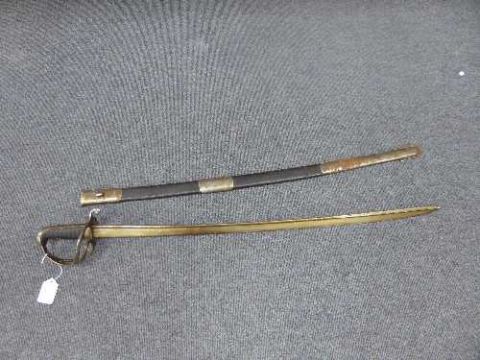 An 1821 pattern light cavalry trooper's sword, curved 85cm pipe-back blade, steel three-bar hilt with folding guard and leather grip, in steel mounted leather scabbard. CONDITION REPORT: Blade covered in a layer of old grease, some rusting, guard with slightly more rusting, grip lacking wire binding. Scabbard mounts with rust, lower mount loose and requires re-fixing. See additional images.