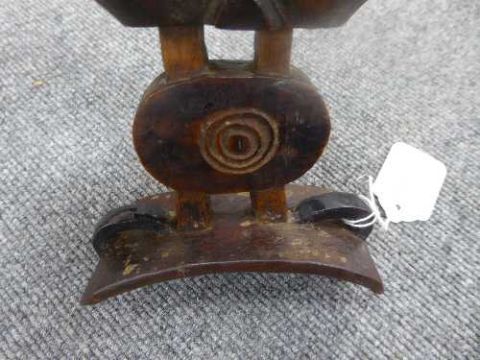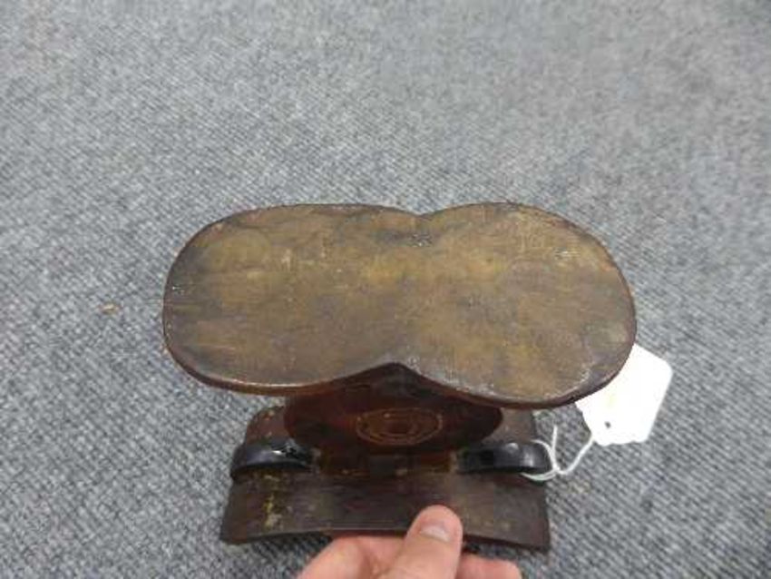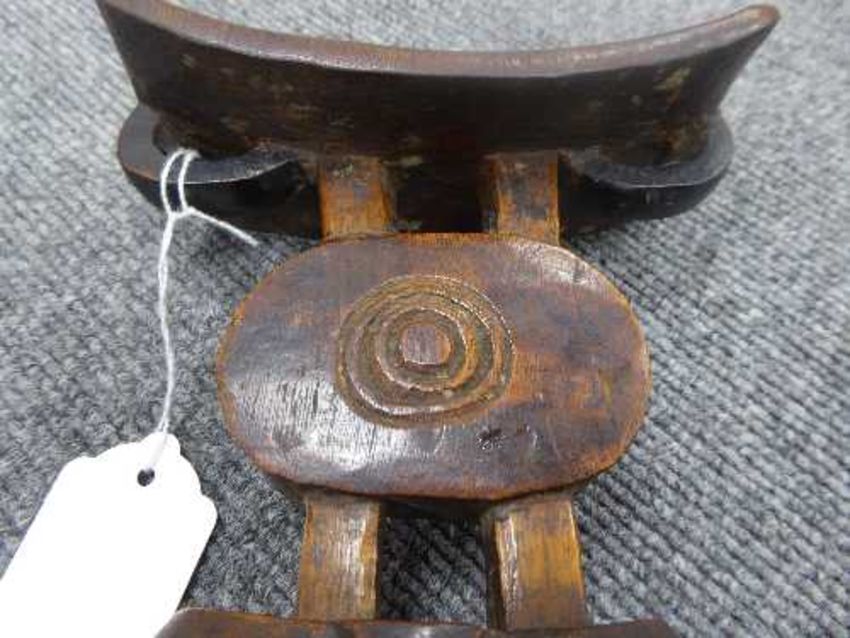A South African Shona tribe wood Headrest, nineteenth century, the dished rectangular pillow with a curved lug to each underside and carved with chevron motifs, on a figure of eight foot, height 14.5cm.