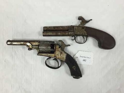 A nineteenth century double barrel percussion pistol, together with a nineteenth century percussion cap revolver. (2) CONDITION REPORT: Actions do not work, aged pitting throughout, some screws missing.