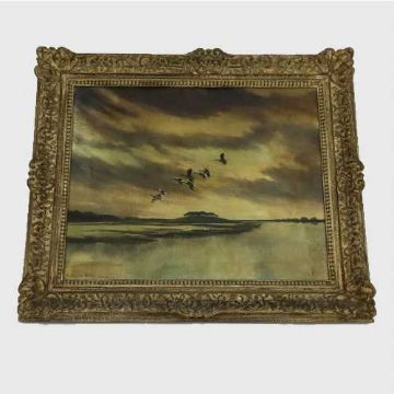 Robert Jobson : Greylags over a river, oil on canvas, signed, dated '51, 40 cm x 50 cm, framed.