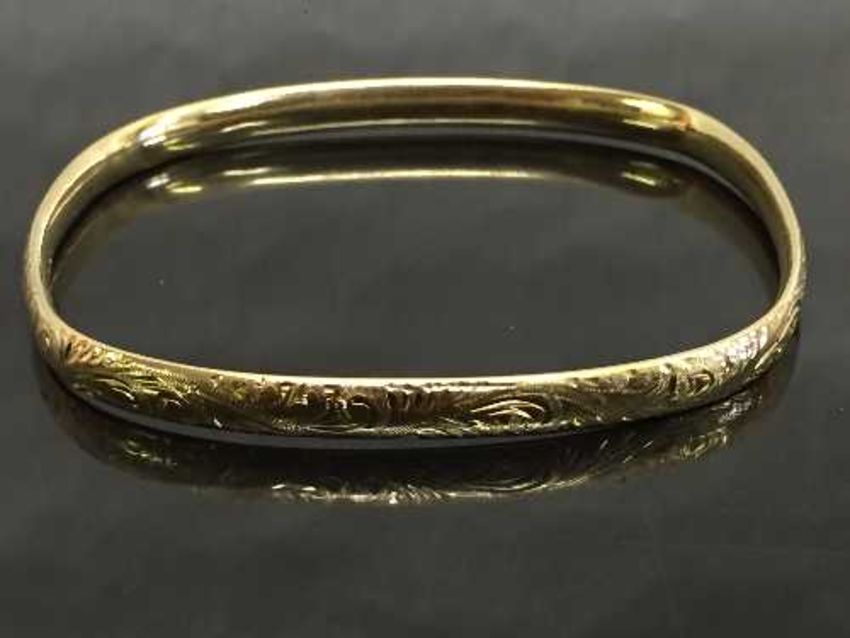 A 9ct gold shaped and engraved bangle, diameter 6.5 cm x 6 cm, 18.6g.
