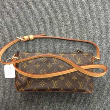 Louis Vuitton : A lady's hand bag, monogram canvas with tan trim, with zip top, with tan shoulder strap, width at widest point 26 cm, in a Louis Vuitton protective cloth sack, in a Louis Vuitton brown carrier bag.