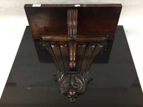 A mid nineteenth century mahogany wall bracket, the back carved with seven plumes , the table veneered and supported by a recurving support, height 40cm.