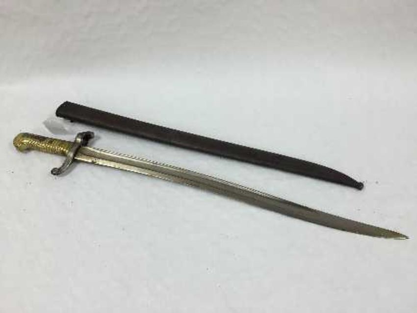 A French Chassepot Yataghan sword bayonet, 57cm recurving blade, black painted steel scabbard. CONDITION REPORT: Blade with light pitting but quite clean, spots of rust to steel guard, grip spring release button is present, pitting to scabbard