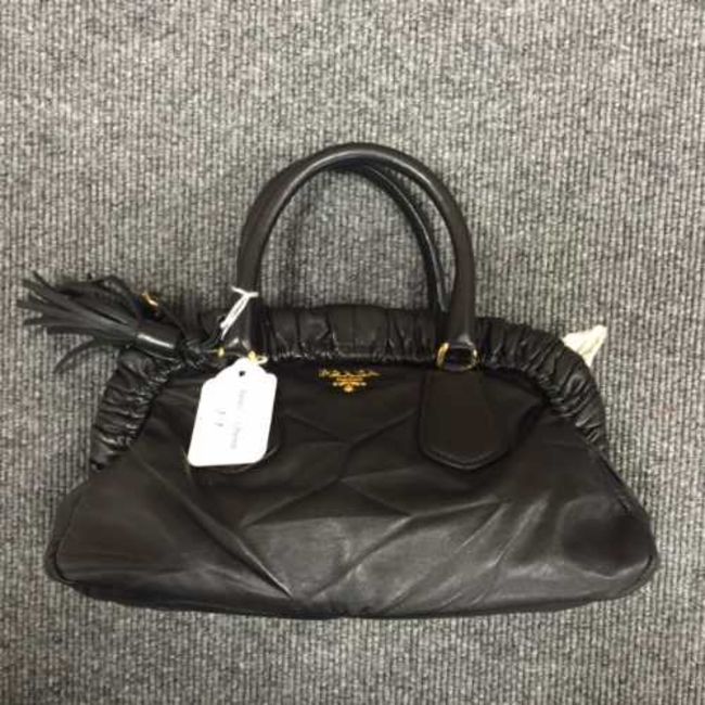 Prada : A lady's hand bag, soft black leather, with brass labelling, with leather fob and tassle, with press-stud closing top, with twin carry handles, with pink lining, width at widest point 27 cm, in a white Prada protective cloth carry sack, in a white Prada carrier bag.
