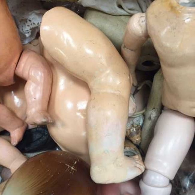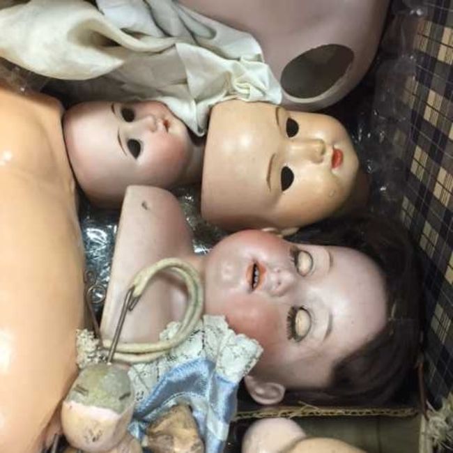 A trunk containing various vintage doll parts, bisque heads, limbs and clothing. (Q)