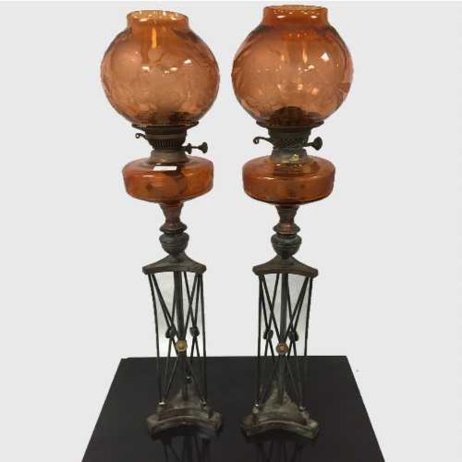 An unusual pair of Arts and Crafts bronze and orange etched glass oil lamps, on stepped plinth bases with slender bronze supports, height 88cm.