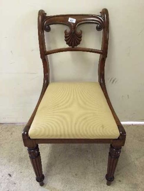 A fine set of six nineteenth century mahogany dining chairs, upholstered in golden striped material, with carved shell motif backs on reeded legs. (6)