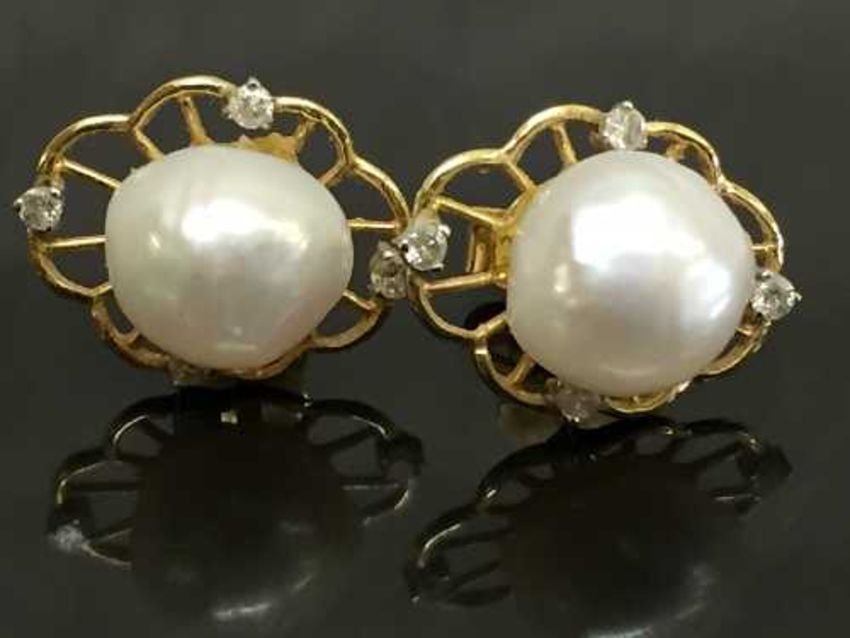 A pair of continental gold blister pearl and diamond earrings. (2)