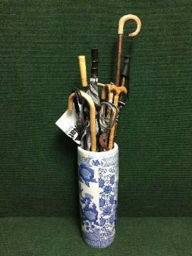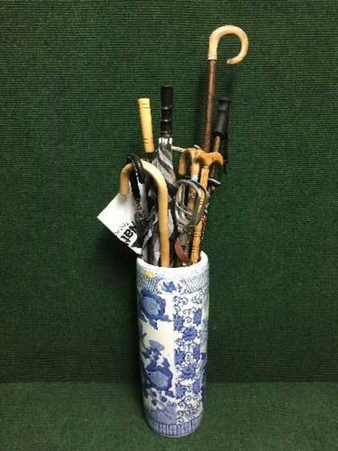 A blue and white oriental stick stand and a large quantity of walking sticks, Shepherd's crook, shooting stick etc