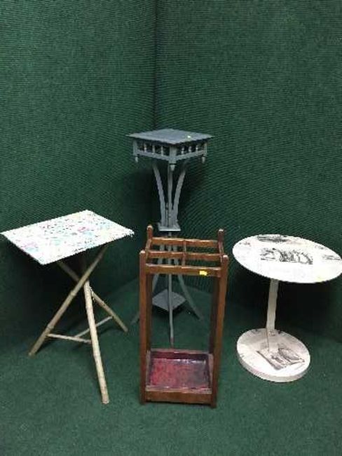 An oak stick stand with metal tray, painted plant stand, glass topped occasional table and a bamboo plant stand