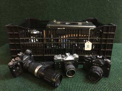 A box of cameras including Zenit, Helena, Minolta etc, together with a boxed Zenit-ES photo sniper in case with lens