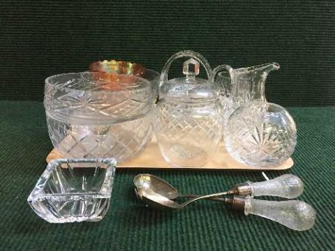 A tray of assorted lead crystal including basket, fruit bowls, tankard etc and a carnival glass bowl