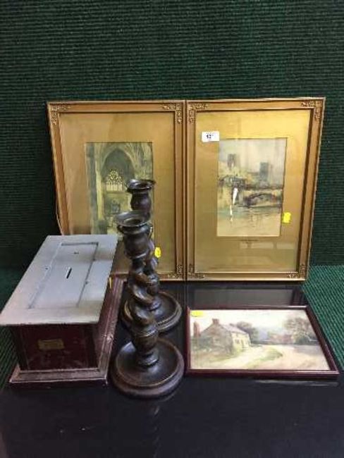 Two gilt framed antiquarian prints - Durham Cathedral by C. Manning, Exeter cathedral by J. G. Bearer, a small framed watercolour, pair of oak candlesticks and an early twentieth century safe (no key)