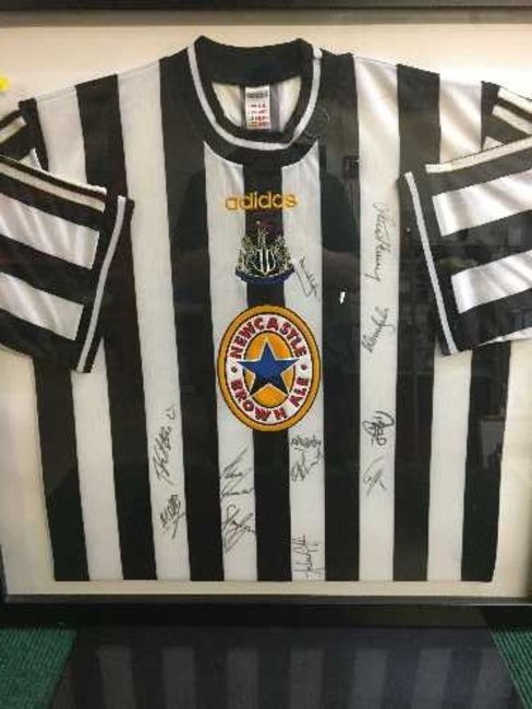 A framed and signed Newcastle United Football shirt - signed by the team bearing Newcastle Brown Ale advertising
