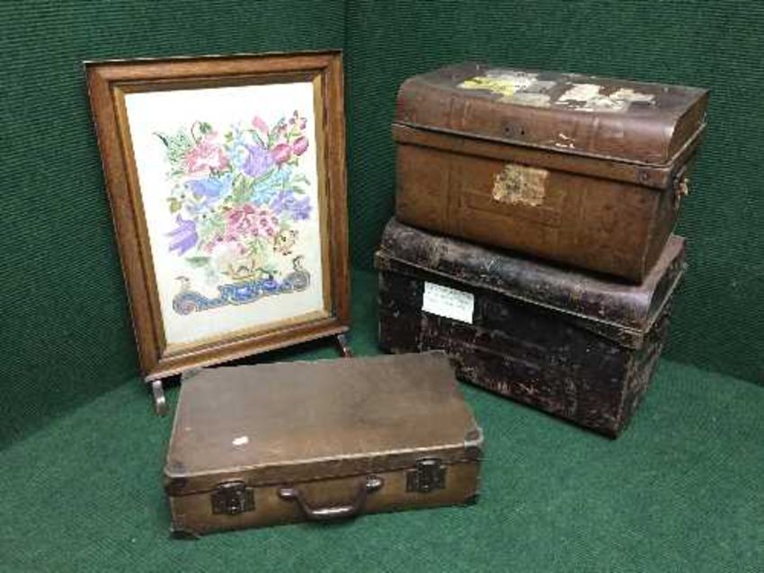 An oak framed embroidered fire screen, vintage luggage case and two tin trunks