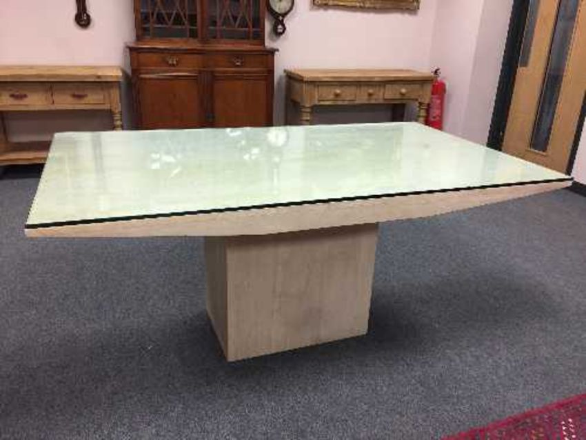 A marble dining table on pedestal base with plate glass top, 170cm by 170cm