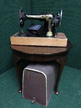 A walnut pie crust edge coffee table together with a Singer sewing machine in case