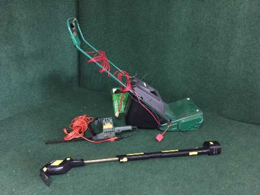 A qualcast electric lawnmower together with a Black and Decker hedge trimmer together with a G-Tech garden multi-tool
