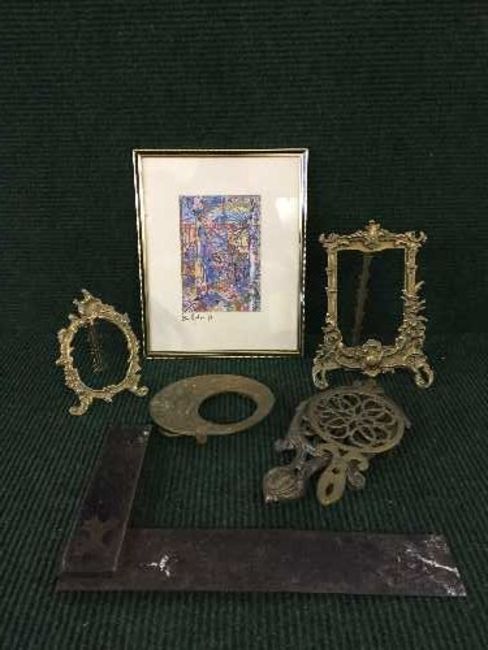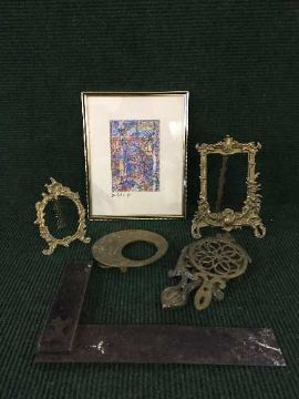 A basket of antique sets of two brass trivets, three gilt metal photograph frames, signed print by Graham dated 89.