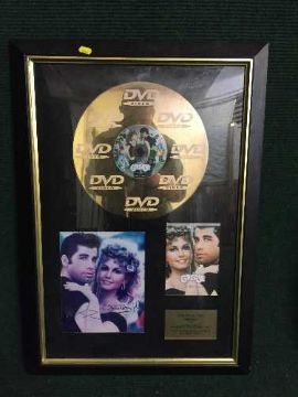 A framed Grease disc, signed photograph of John Travolta and Oliver Newton John