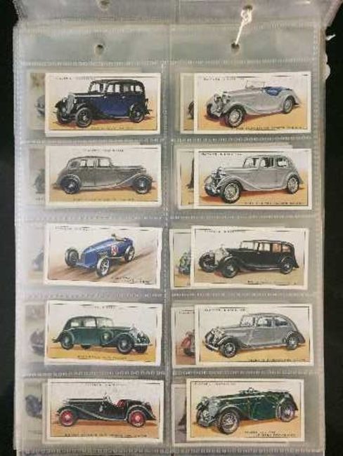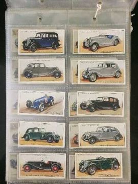 A collection of cigarette cards relating mainly to aeronautical subjects : Flying by Senior Service, Wings Over the Empire by Churchman, Empire Air Routes by Lambert & Butler, International Air Liners by John Player, Aircraft of the Royal Air Force by John Player, Aeroplanes by Gallaher, Speed by Wills, Motor Cars by John Player, Motor Cars by Lambert & Butler, Famous M.G. Marques by Grandee, Alfa Romeo by Golden Era, London Buses by Golden Era and British Buses by Golden Era. (Q)